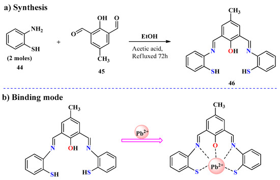 Lead (Pb) is a common heavy metal that finds use in the current industrialized world including paints, fuel, batteries, and other materials [131,132,133]. In several domains, Pb2+ is essential as a transitional element [134]. The production of lead nitrate for commercial use began in the 19th century, according to lead history [135]. At the time, it was mostly utilized in the industrial sector as the primary raw material for pigment production [136]. Lead (Pb) made a substantial contribution to industrial output. In the industrial sector, it was used as a heat stabilizer in thermal imaging paper, nylon, and polyester coatings [137,138,139]. According to recent research, lead (Pb) and its compounds enter the body through wastewater and waste residues and harm the kidney, brain, digestive system, and other organs and systems [140]. One of the most damaging heavy metal pollutants in the environment is the lead ion (Pb2+), which constitutes significant risks to all living things and generates persistent problems, particularly with regard to human health and animal [141,142]. Even at extremely low levels, chronic exposure causes a variety of health issues, including neurological illnesses, cardiovascular diseases, fertility diseases, and hypertension [143,144]. Keeping in view the above-mentioned health threat associated with lead poisoning, it is of key relevance to detect and determine its presence in various environmental and biological samples [145,146,147,148]. Pb2+ ions could possibly be found and determined using a variety of methodologies, including the most potent, precise, and practical colorimetric and fluorescent sensing technologies [149,150]. 2-Aminothiophenol 44 and 2-hydroxy-5-methylbenzene-1,3-dialdehyde 45 were added in ethanol and a catalytic amount of acetic acid. The resultant mixture was refluxed for 72 h. The precipitate of 46 was then collected on filter paper (Scheme 10) [151].