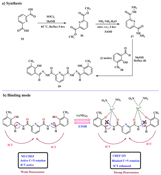 (a) Synthesis of pyridinecarbohydrazide-based fluorescent chemosensor 59. (b) Proposed binding mode.