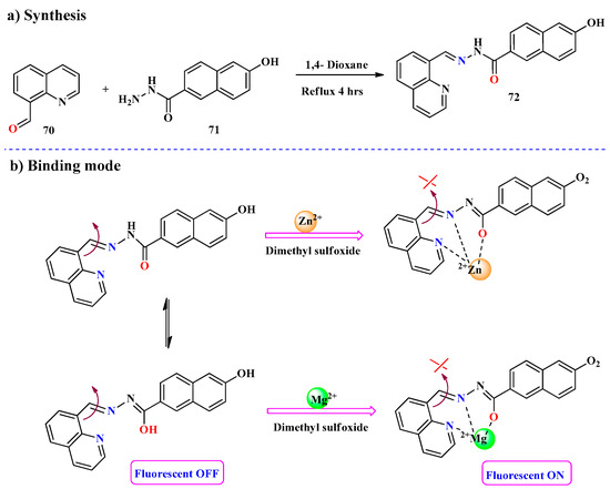 Y. Ding, C. Zhao, and their collaborators developed an efficient detection chemosensor for Zn and Mg metal ions. A chemosensor 6-hydroxy-N′-(quinolin-8-ylmethylene)naphthalene-2-carbohydrazide 72 was synthesized by refluxing quinoline-8-carboxaldehyde 70 and 6-hydroxy-2-naphthoic hydrazide 71 in 1,4-dioxane for 4 h, yielding 78% of the intended product 72 (Scheme 16) [179]. Sensor 72 demonstrated quick identification of Zn2+ in DMSO/H2O (4:1, v/v) and Mg2+ in ethanol/water (9:1, v/v) as dual purpose turn-on fluorescence chemosensor. The coordination reaction between 72 and the target ions, which encouraged intramolecular charge transfer and inhibited the C=N isomerization process, was linked to the improvement in fluorescence detection. At the same time, a quick color shift from colorless to yellow or yellowish-green under UV light (365 nm) was readily apparent to the naked eye. The limits of detection and quantification under ideal circumstances were 32.3 nM and 97.8 nM for Zn2+ and 16.1 nM and 48.9 nM for Mg2+, respectively.
