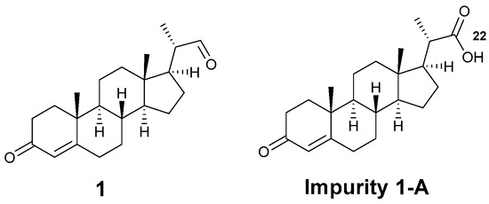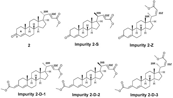 Compound 1 was refluxed in a mixture of sulfuric acid and ethanol to racemize the C(20) methyl group based on the methods that have been reported [18]. Subsequently, the side chain was extended by the Horner–Wadsworth–Emmons reaction, and the impurity 2-S (Figure 2) was synthesized successfully and characterized by the 1H NMR. The comparison of HPLC peak positions of isolated compounds 2 and 2-S with the original process reaction mixture was shown in Figure 3.