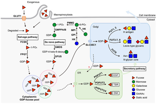 All FUTs utilize guanosine diphosphate (GDP)-fucose as a donor to transfer fucose to acceptor molecules. GDP-fucose is synthesized in the cytosol, then transported into the Golgi or ER, where it is used by Golgi-localized FUTs or ER-localized POFUTs, respectively. In mammals, GDP-fucose is synthesized via two pathways: the de novo pathway and the salvage pathway (Figure 1). The de novo pathway produces GDP-fucose from mannose or glucose, while the salvage pathway generates GDP-fucose from exogenous fucose or fucose salvaged from glycoconjugate degradation.