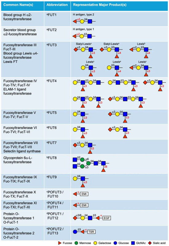 The Golgi-localized FUTs include FUT1–9, all of which transfer fucose to glycan structures as terminal or core modifications. FUT1, FUT2, and Sec1 (non-functional protein encoded by a pseudogene) are α2-FUTs that belong to the CAZy GT11 family [26,27]. FUT1 and FUT2 are responsible for synthesizing the H antigens (O blood), which serve as fucosylated precursors for the A and B oligosaccharide structures in the ABH blood group system [28,29]. They exhibit distinct tissue expression patterns and acceptor specificities. FUT1 product (H antigen) is primarily expressed on erythrocyte membranes and vascular endothelium, with a preference for type 2 structures, whereas FUT2 (Se) is predominantly expressed in epithelial cells and exocrine secretions and is more active on type 1 structures. FUT3–7 and FUT9 are α3/4-FUTs that belong to the CAZy GT10 family, all of which have α3 activity, except FUT3 and FUT5, which also possess α4 activity [30,31,32,33,34,35]. These FUTs are involved in the synthesis of the complex series of Lewis antigen epitopes (i.e., Lewisx, Lewisy, Lewisa, Lewisb, Sialyl-Lewisx, Sialyl-Lewisa) with distinct acceptor specificities. The biological roles of the ABH and Lewis antigens have been previously reviewed in detail [36]. FUT8 is the only α6-FUT identified in mammals, belonging to the CAZy GT23 family [37,38]. FUT8 catalyzes N-glycan core fucosylation by transferring a fucose moiety to the innermost GlcNAc residue of the chitobiose unit. Core fucosylation plays critical roles in the regulation of antibody-dependent cellular cytotoxicity (ADCC) and serves as a biomarker for various types of cancer [39,40].