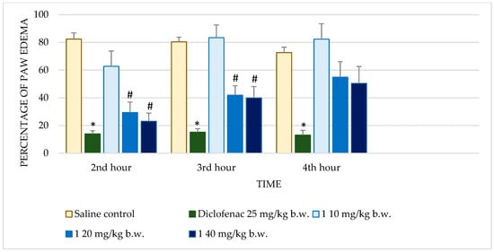 Comparison of edema percentage in carrageenan-induced paw edema model between saline and positive control groups and compound 1. * p < 0.001 compared to control, # p < 0.05 compared to control.
