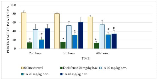 Comparison of edema percentage in carrageenan-induced paw edema model between saline and positive control groups and compound 1A. * p < 0.001 compared to control, # p < 0.05 compared to control.