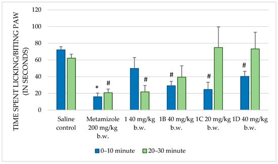Comparison of the time spent licking/biting paw (in seconds) in formalin test between saline and positive control, and compounds 1, 1B, 1C, and 1D. * p < 0.001 compared to control, # p < 0.05 compared to control.