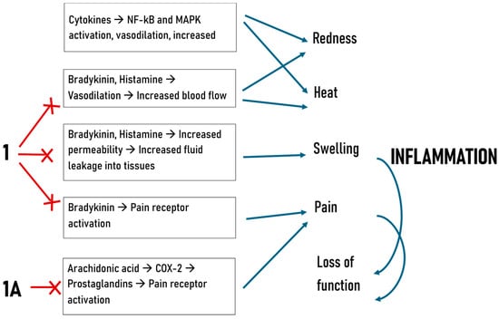 The following diagram (Figure 4) was included to illustrate the signal transduction pathways involving the molecules, along with those related to the inflammatory process and its five signs, highlighting the specific levels at which the newly synthesized compounds exert their effects according to the study’s results.
