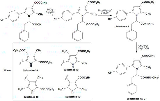 The hydrazones were synthesized by reacting a pyrrole hydrazide with substituted pyrrole aldehydes. The aldehydes were chosen to incorporate a second pyrrole heterocycle into the hydrazone molecules, facilitating the analysis of structure–activity relationships. The starting carbohydrazide was obtained via the selective hydrazinolysis of N-pyrrolylcarboxylic acid ethyl ester. The target compounds were synthesized according to the procedure presented in Figure 5, and their structures were confirmed using IR, 1H-NMR, 13C-NMR, and mass spectrometry, with purity verified by HPLC and melting point analysis [42]. The IUPAC names of the compounds were generated using ChemDraw Professional Software, Version 16.0.0.82 (68). The doses of 10, 20, and 40 mg/kg for the compounds N-pyrrolylcarbohydrazide (1) and pyrrole hydrazone derivatives (1A–1D) were chosen based on a broader series of novel compounds with a pyrrolic structure. These doses were consistent with those used in previous studies involving similar pyrrolic derivatives, allowing for a more direct comparison across various compounds in the series. Maintaining these dose levels also ensured consistency for future quantitative structure–activity relationship (QSAR) analyses, facilitating more reliable comparisons and aiding in the identification of structural features that correlate with pharmacological activity.