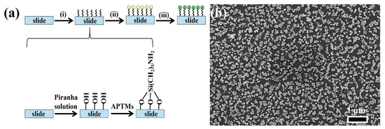 (a) SERS substrate preparation process: (i) hydroxylation and silanization, (ii) modified nanomaterials: the surface of the slide was chemically modified with silane molecules to create a substrate with amino functional groups, providing active sites for the attachment of nanoparticles, (iii) Immobilized nanomaterials: Nanoparticles are immobilized on functionalized surfaces through chemical bonding to form substrates that exhibit SERS-enhancing effects; (b) SEM image of the NPAS substrate.