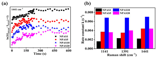To quantitatively evaluate the catalytic performance of NPAS1, the reaction kinetics of PNTP molecule coupling to form DMAB molecules is analyzed. In Figure 6c, the variation of ln(2IDMAB/IPNTP + 1) over time at 1141 cm−1, 1391 cm−1, and 1441 cm−1 on the NPAS1 substrate is observed. These peaks are typical of the characteristic peaks of the DMAB molecule. As shown in Figure 6c, at first, an increasing number of PNTP molecules are converted into DMAB molecules. After a certain period of illumination, saturation is reached, indicating that the conversion of PNTP to DMAB is nearly complete. The reaction rate constants at the initial stage for various peak positions on the NPAS substrates were determined by analyzing different Raman peaks. For instance, the rate constants at the peaks of 1141 cm−1, 1391 cm−1, and 1441 cm−1 are 0.0016 s−1, 0.0023 s−1, and 0.0022 s−1, respectively. The rate constants of the three characteristic DMAB peaks differ. The rate constant at 1141 cm−1 is lower than those at 1391 cm−1 and 1441 cm−1. One possible explanation is the difference in the breaking and formation of chemical bonds. In other words, different peaks have different processes for the transport and absorption of hot electrons. The SERS spectra of PNTP molecules on NPAS5, NPAS10, and NPAS20 substrates as a function of illumination time are shown in Figure 6d–f. The PNTP molecules undergo a similar transformation on these substrates, gradually coupling into DMAB molecules under laser irradiation.