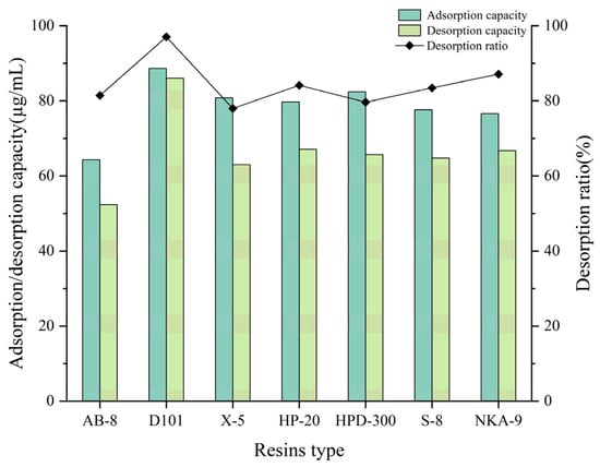 The static adsorption/desorption properties of different resins were investigated to identify a suitable resin for the total alkaloids, with the results shown in Figure 1. It was observed that D101 macroporous resin exhibited favorable adsorption and desorption effects on the alkaloids. Therefore, the adsorption kinetics and thermodynamics of D101 macroporous resin for the alkaloids of Piperis longi fructus will be further studied.