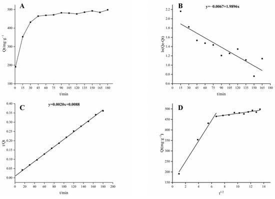 The results of adsorption kinetics. (A) Adsorption kinetic curves; (B) the pseudo-first-order model; (C) the pseudo-second-order model; (D) the Weber–Morris model. Qt represents the adsorption per unit of resin at the moment t; Qe represents the equilibrium adsorption per unit of resin.