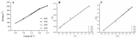 The results of adsorption thermodynamics. (A) Adsorption isotherms. (B) Langmuir models. (C) Freundlich models. Three models for total alkaloids on D101 resin at 40, 45, 50 and 55 °C. Qe represents the adsorption capacity at equilibrium; Ce represents the equilibrium concentration.