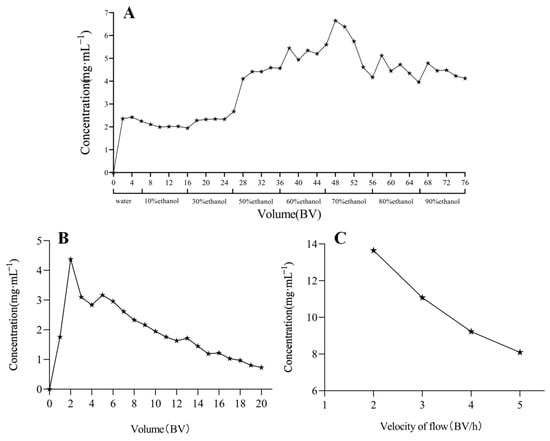 The results of the flow rate investigation showed that a flow rate of 2 BV/h was selected as the elution flow rate for the total alkaloid component. Based on the above considerations, the column elution process was established as follows: 10 BV of 70% ethanol eluted at a flow rate of 2 BV/h.