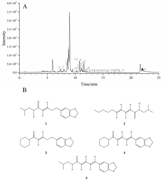 Results of the component analysis by UPLC-Q-ZENO-TOF-MS/MS. (A) The base peak chromatogram (BPC) of Piperis longi fructus in the positive-ion mode; (B) the structure of five high-content alkaloid components, where (1) is 4,5-dihydropiperlonguminine, (2) is pellitorine, (3) is piperanine, (4) is piperine, and (5) is piperlonguminine.