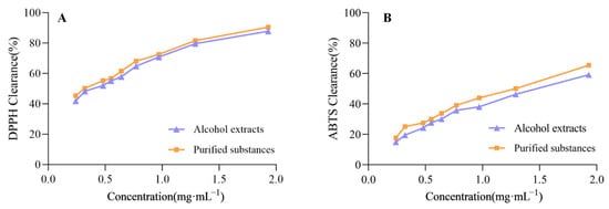 The scavenging activities of Piperis longi fructus on DPPH and ABTS+ radicals are illustrated in Figure 6. As the concentration of the sample increased, the scavenging rates of DPPH and ABTS+ exhibited a dose-dependent relationship. It can be observed from the results that the antioxidant activity after purification is better than that of the crude extract. The IC50 of DPPH and ABTS+ free radical scavenging was calculated by fitting the equation with the mass concentration of (X) and the inhibition rate of the crude extract and purified product as (Y). The linear equations are shown in Supplementary Materials Table S2. The DPPH and ABTS+ free radical scavenging were increased by about 1.5 times and 1.15 times after enrichment with D101 macroporous resin.