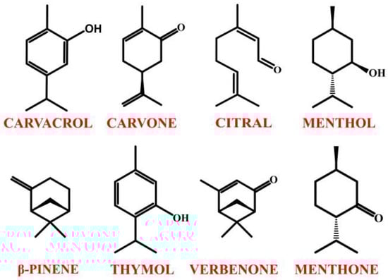 monoterpenes; molecular scaffold; carvacrol; carvone; citral; menthol; β-pinene; thymol; verbenone; menthone 1. Introduction