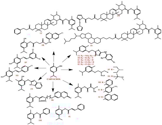 Carvacrol derivatives are an interesting group of chemical compounds with a broad spectrum of biological activities, including anticancer, antimicrobial, and inhibitory properties against key metabolic enzymes. Structural modifications of carvacrol, such as the introduction of thiosemicarbazide, sulfonic, coumarinic, or benzimidazole groupings, significantly improve its biological activity and may form the basis for the development of new drugs and therapeutic agents. Numerous studies have shown that carvacrol derivatives have potential applications in the treatment of neurodegenerative diseases, cancers, and bacterial infections, especially in the context of pathogens resistant to classical antibiotics. The newly synthesized carvacrol derivatives, which include thiosemicarbazides 1A–1E (Figure 2) and 1,3,4-thiadiazol-2-amine derivatives, have shown strong inhibitory properties against key metabolic enzymes, making them potential candidates for therapeutic applications. Enzyme assays showed that all compounds tested effectively inhibited human carbonic anhydrases I and II (hCA I and hCA II), acetylcholinesterase (AChE), and butyrylcholinesterase (BChE), with activity superior to standard inhibitors. Further, molecular docking analysis confirmed the high specificity and strong affinity of the tested carvacrol derivatives for the enzymes, increasing their potential therapeutic value. The significant inhibition of AChE and BChE points to the possibility of using these compounds in the treatment of neurodegenerative diseases, such as Alzheimer’s disease, through a mechanism of inhibition of acetylcholine-degrading enzymes. Inhibition of carbonic anhydrases, on the other hand, suggests the possibility of using these derivatives in the treatment of glaucoma, epilepsy, or cancer. The results obtained confirm that the newly synthesized carvacrol derivatives may represent promising enzyme inhibitors with high therapeutic potential [36]. The newly developed carvacrol derivatives, comprising eight 2-aminothiols and three sulfonic acid derivatives, showed potent inhibitory activity against key metabolic enzymes. Their activity was assessed in terms of inhibition of the isoenzymes human carbonic anhydrase I and II (hCA I and hCA II), acetylcholinesterase (AChE), butyrylcholinesterase (BChE), and α-glucosidase. Of the compounds tested, sulfonic acid derivatives 1F and 1G (Figure 2) showed the highest efficacy against carbonic anhydrase isoenzymes, suggesting their potential use in the treatment of metabolic disorders. The potent inhibitory activity of AChE and BChE indicates the potential use of these derivatives in the treatment of neurodegenerative diseases, while the ability to inhibit α-glucosidase suggests potential use in the treatment of type 2 diabetes by reducing carbohydrate absorption [37]. In terms of anticancer activity, the 1H–1J (Figure 2) derivatives showed significantly higher cytotoxicity than carvacrol [38]. Of these, 1J showed the highest selectivity, suggesting its potential for further preclinical studies. In addition, derivative 1I, which is a hybrid of coumarin and carvacrol, showed potent cytotoxic activity against MCF-7, PC-3, and HT-29 cancer lines. Structural modification of carvacrol to link to the coumarin system may have significantly improved its biological activity [34].