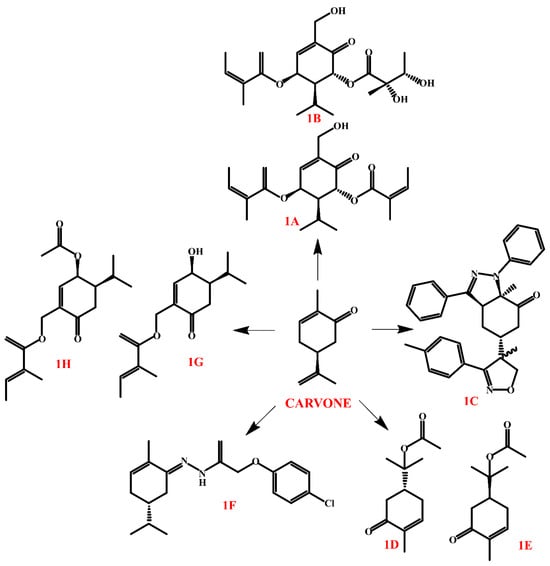 The anti-inflammatory activity of carvone derivatives is manifested by reducing the expression of pro-inflammatory cytokines, such as TNF-α, IL-1β, and IL-6, and inhibiting the activity of the transcription factor NF-κB, which effectively reduces inflammatory responses. Derivatives 1D and 1E (Figure 3), which were most effective, inhibited iNOS expression and NO production, suggesting their potential use in the treatment of inflammatory diseases. These derivatives also showed the highest predicted activity against Sirtuin-1 (SIRT1), an enzyme involved in the regulation of inflammatory response and metabolism [53].
