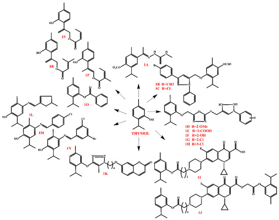 Thymol derivatives exhibit a wide range of biological activities, including anticancer, antibacterial, antifungal, and insecticidal effects. The structural modifications of thymol, such as thiosemicarbazone, coumarin, pyrrole, methoxy-pyrazole, and halogen substitutions, significantly increase its efficacy, making these compounds promising candidates for further pharmacological and agrochemical studies. In terms of anticancer activity, thymol derivatives exhibit the ability to inhibit cancer cell proliferation by inducing apoptosis and arresting the cell cycle. Derivative 1A (Figure 7), a hybrid of thiosemicarbazone and thymol, showed the ability to induce apoptosis and arrest the cell cycle in the G2/M phase. In turn, derivatives 1B and 1C (Figure 7), containing a p-methoxy-pyrazole group, showed better cytotoxicity, suggesting that the substitution of the ether group improves their anticancer activity. Derivatives 1D–1H (Figure 7) showed selectivity for specific tumor lines, with 6d being particularly effective against HCT-116. Thymol–ciprofloxacin hybrids (1I and 1J, Figure 7) showed some activity, although no clear trend in the structure–activity relationship was demonstrated. Derivatives 1K (Figure 7), thymol–coumarin hybrids, showed good activity by inducing apoptosis, while derivatives 1L–1N (Figure 7), containing halogen groups, were characterized by high antitumor efficacy [119,120,121,122].