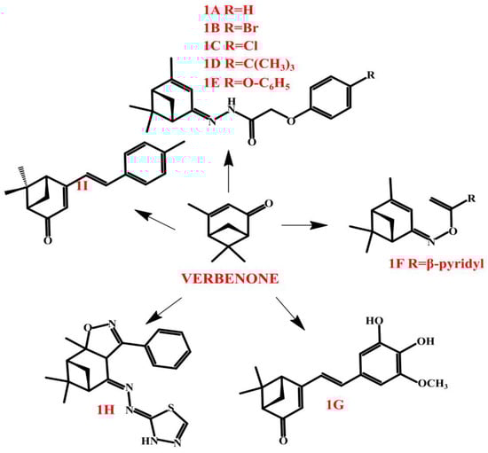 As previously mentioned in the ‘Biological activity’ Section, verbenone is characterized by strong antifungal activity. Many scientists focus on modifications of verbenone in order to improve its activity, which could be used in industry, and many of the attempts are successful. An example of a series of novel compounds are (Z)- and (E)-verbenone derivatives bearing an oxime ester moiety [128]. Among the twenty-seven compounds, the compound 1F (Figure 8) demonstrated strong antifungal activity, inhibiting Alternaria solani (92.2%), Physalospora piricola (80.0%), and Cercospora arachidicola (76.3%) at 50 µg/mL. Its herbicidal properties were also preliminarily assessed. Seven compounds showed strong herbicidal activity, inhibiting Brassica campestris root growth by over 90% at 100 µg/mL and outperforming the commercial herbicide flumioxazin (63% inhibition) [125].