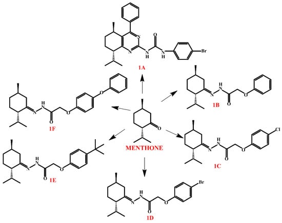 Nesterkina and co-workers presented menthone derivatives (the combination of menthone and phenoxyacetic acid) (compounds 1B–1F, Figure 9) with probable anticonvulsant effect [146]. The properties of the compounds were assessed using the pentylenetetrazol (PTZ) model, which involves measuring the minimum effective doses (MEDs) of pentylenetetrazole required to trigger clonic–tonic convulsions (CTC) and tonic extension (TE) in experimental animals. Based on the experimental findings, it can be concluded that menthone hydrazones derived from para-substituted phenoxyacetic acids exhibit anticonvulsant activity in both PTZ and MES tests over short (3 h) and long (24 h) durations.