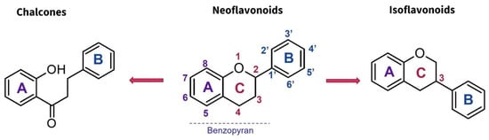 Flavonoids are the most extensive group of polyphenols with a wide distribution in the plant kingdom, which has played an interesting role in their evolutionary development. These metabolites play different functions in the chemical defense and adaptive response of higher plants to biotic and abiotic stress factors, such as UV light, oxidative stress, and microbial infections [55]. At the structural level, flavonoids present a basic flavan scaffold, commonly known as C6-C3-C6, formed by two phenyl rings (C6), A and B, that are linked to a pyran (C3), the C ring (Figure 1). Although flavonoids have a simple skeleton compared to other polyphenols, more than 10,000 structures have been reported, which are grouped into three classes according to differences in the substitution pattern and oxidation in the C ring (Figure 1). Neoflavonoids comprise the most extensive group with six sub-classes: flavones, flavanones, flavonols, flavononols, catechins, and anthocyanins. Chalcones belong to an apart sub-class characterized by the absence of a C ring and are the biosynthetic precursors of neoflavonoids. Isoflavones have an isoflavonoid core (Figure 1) and are characterized by restricted distribution in plants since they are mainly found in the Fabaceae family [56,57].