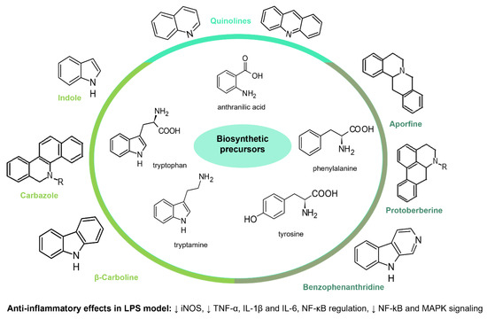 The huge chemical diversity of alkaloids has hindered structure–activity relationship (SAR) studies in figuring out the pharmacophoric motifs linked to the anti-inflammatory effects of alkaloids. However, it is worth pointing out that a high percentage of the anti-inflammatory alkaloids reported so far, share a common chemical feature: biosynthetic precursors (Figure 3).