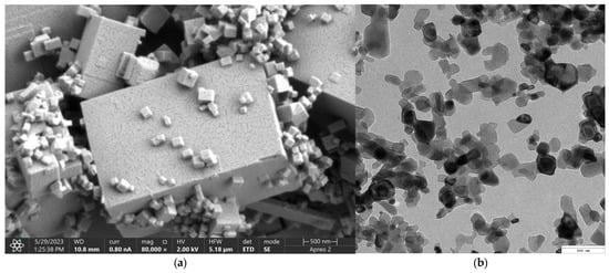 Figure 3 presents microphotographs of the MgO ((a)—SEM and (b)—TEM, respectively). The SEM micrograph of MgO powder (Figure 3a) reveals a well-defined crystalline morphology, indicative of its high degree of crystallinity. The particles exhibit a cubic structure, consistent with the characteristic morphology of periclase. The surface of the particles appears smooth with sharp edges, confirming the presence of highly ordered crystal planes. Particle sizes are relatively uniform, which agrees with previous reports on MgO periclase synthesis. Additionally, agglomeration is minimal, suggesting a high purity of the synthesized material and an absence of significant structural defects. The high crystallinity observed in the SEM images correlates with the material’s inherent thermal stability and mechanical properties, making it suitable for applications requiring structural integrity and resistance to degradation. The well-defined edges and uniform morphology also indicate a controlled synthesis process, ensuring reproducibility for further applications. The TEM images provide further insight into the microstructural features of MgO periclase. The lattice fringes observed in high-resolution TEM (Figure 3b) images confirm the highly crystalline nature of the material. Moreover, the TEM analysis highlights the absence of significant defects, dislocations, or amorphous regions, reinforcing the findings from SEM. The uniformity in particle distribution and crystallinity suggests that the synthesis method employed effectively controls nucleation and growth, resulting in a material with excellent structural homogeneity. These structural characteristics of MgO periclase have significant implications for its applications in catalysis, biomedicine, and refractory materials. The high crystallinity ensures optimal thermal and chemical stability, while the well-defined morphology enhances its reactivity in surface-related applications. The absence of amorphous phases also indicates minimal impurities, further confirming the high-quality synthesis of the material.