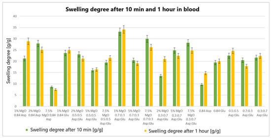 The highest swelling properties were observed for the 1% MgO 0.84 Asp sample in water, the 7.5% MgO 0.3:0.7 Asp sample in SBF, and the 1% MgO 0.7:0.3 Asp sample in blood. Conversely, the poorest swelling properties were recorded for 7.5% MgO 0.84 Asp in both SBF and blood, as well as for 5% MgO 0.5:0.5 Asp in water. Over time, certain samples exhibited a decrease in swelling ratios. In water, the 1% MgO 0.84 Asp sample showed a reduction, while in SBF, the 1% MgO 0.84 Glu and 5% MgO 0.5:0.5 Asp samples exhibited decreased swelling. In blood, the 2% MgO 0.5:0.5 Asp and 5% MgO 0.7:0.3 Asp samples experienced similar reductions. Furthermore, in SBF and blood, the 2% MgO 0.84 Asp, 5% MgO 0.7:0.3 Asp, and 7.5% MgO 0.7:0.3 Asp samples showed a noticeable reduction in swelling ratios. A decrease was also observed for 7.5% MgO 0.84 Asp and 7.5% MgO 0.3:0.7 Asp in water and blood. Conversely, some samples exhibited further swelling over time. The 1% MgO 0.84 Glu and 5% MgO 0.5:0.5 Asp samples swelled further in both water and blood, while the 2% MgO 0.5:0.5 Asp, 7.5% MgO 0.5:0.5 Asp, 5% MgO 0.3:0.7 Asp, and 7.5% MgO 0.84 Asp samples continued to swell in water and SBF. In addition, the 1% MgO 0.7:0.3 Asp, 2% MgO 0.3:0.7 Asp, and 7.5% MgO 0.5:0.5 Asp samples showed continuous swelling across all media. Notably, swelling ratios for the 2% MgO 0.84 Asp sample increased further in water, while 1% MgO 0.84 Asp and 7.5% MgO 0.3:0.7 Asp displayed an increase in SBF.