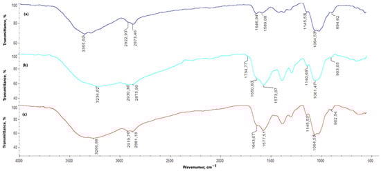 FT-IR spectra of: (a)—native chitosan; (b)—0.5:0.5 Asp:Glu sample; (c)—5% MgO 0.5:0.5 Asp:Glu sample.