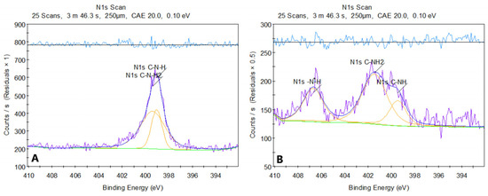 Figure 8 presents the XPS spectrum of pure chitosan (a) and sample 2. The XPS spectrum of chitosan before modification shows two peaks in the N 1s region, located around ~399 eV. The first corresponds to the amine group C-NH2 (~399 eV), and the second to the amide group C-NH (~398.8–399.5 eV). Both signals are characteristic of the structures present in chitosan, where nitrogen exists in the form of amine and amide groups, without significant protonation or other strong chemical modifications.