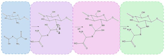 The chemical crosslinking mechanism between chitosan and amino acids containing two carboxylic groups, such as aspartic acid and glutamic acid, involves the formation of amide bonds through a condensation reaction between the amine groups (-NH2) of chitosan and the carboxylic groups (-COOH) of the amino acids. Under microwave-assisted conditions, this process is significantly enhanced due to rapid heating and increased molecular mobility, which facilitates efficient bond formation.