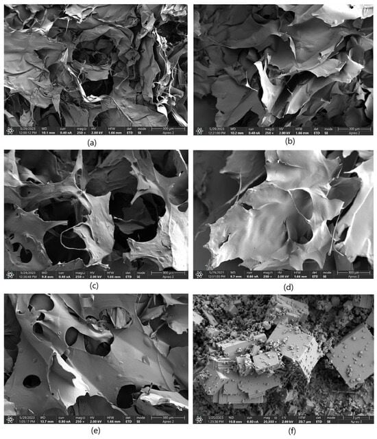SEM images of the samples: (a)—1% MgO 0.84 Glu; (b)—7.5% MgO 0.7:0.3 Asp:Glu; (c)—5% MgO 0.3:0.7 Asp:Glu; (d)—2% MgO 0.84 Asp; (e)—2% MgO 0.5:0.5 Asp:Glu; (f)—periclase nanoparticles.
