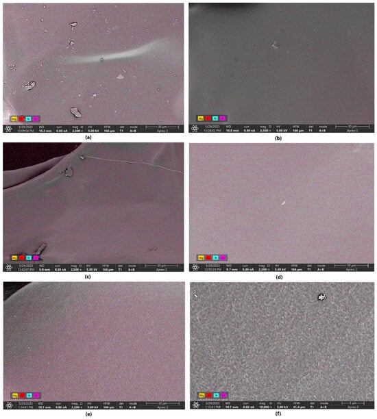 EDS mapping of the samples: (a)—1% MgO 0.84 Glu; (b)—1% MgO 0.84 Asp; (c)—5% MgO 0.3:0.7 Asp:Glu; (d)—2% MgO 0.84 Asp; (e)—2% MgO 0.5:0.5 Asp:Glu; (f)—7.5% MgO 0.7:0.3 Asp:Glu.