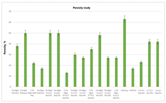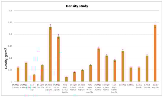 Analyzing the volume porosity (Figure 12) and volume density (Figure 13) values of the obtained samples reveals that for 2% MgO 0.5:0.5 Asp and 5% MgO 0.5:0.5 Asp, both values are higher compared to the reference hydrogels (without periclase). Increased porosity was also observed for 2% MgO 0.3:0.7 Asp, while higher density was noted for 2% MgO 0.84 Asp and 1% MgO 0.84 Glu. Conversely, lower values for both porosity and density were obtained for 7.5% MgO 0.84 Asp, 7.5% MgO 0.5:0.5 Asp, 1% MgO 0.7:0.3 Asp, 5% MgO 0.7:0.3 Asp, and 7.5% MgO 0.7:0.3 Asp. Lower porosity was also observed for 1% MgO 0.84 Asp, 5% MgO 0.3:0.7, and 7.5% MgO 0.3:0.7 Asp. The same porosity value was obtained for the 1% MgO 0.84 Glu sample, with a similar value observed for 2% MgO 0.84 Asp, 2% MgO 0.3:0.7 Asp, 5% MgO 0.3:0.7 Asp, and 7.5% MgO 0.3:0.7 Asp. The sample with the highest porosity and density was 2% MgO 0.5:0.5 Asp, while the lowest values were found in 7.5% MgO 0.5:0.5 Asp. Samples 2% MgO 0.84 Asp and 2% MgO 0.5:0.5 Asp also exhibited similar porosity.