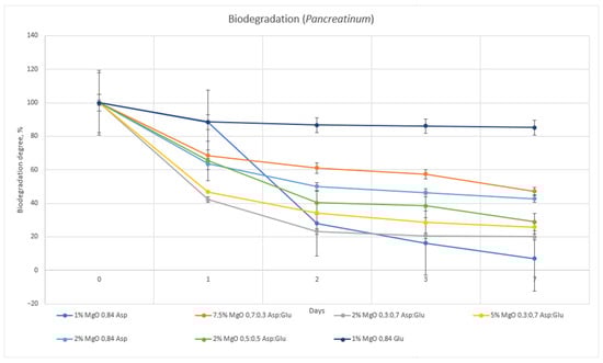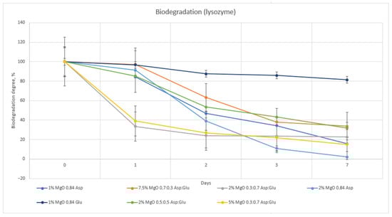 The hydrogel sample 1% MgO 0.84 Glu was the least susceptible to biodegradation by both lysozyme and Creon. The samples with the highest biodegradation rates were 1% MgO 0.84 Asp in Creon and 2% MgO 0.84 Asp in lysozyme. Comparing the two enzymes, lysozyme exhibited superior degradative properties (Figure 14 and Figure 15).