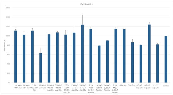 According to ISO 10933 [37] standards for medical devices, a material is considered non-cytotoxic if cell viability is at least 70% relative to the control sample. Among the samples studied, all except 1% MgO 0.84 Glu were non-cytotoxic. The sample with the lowest cytotoxicity was 5% MgO 0.7:0.3 Asp, while the highest cytotoxicity (excluding 1% MgO 0.84 Glu) was observed in 2% MgO 0.3:0.7 Asp. Increased cell proliferation relative to the control was observed in samples of 1% MgO 0.84 Asp, 2% MgO 0.84 Asp, 7.5% MgO 0.84 Glu, 2% MgO 0.5:0.5 Asp, 5% MgO 0.5:0.5 Asp, 7.5% MgO 0.5:0.5 Asp, 1% MgO 0.7:0.3 Asp, 5% MgO 0.7:0.3 Asp, 7.5% MgO 0.7:0.3 Asp, and 7.5% MgO 0.3:0.7 Asp. Greater cell survival in extracts of biomaterials containing periclase, compared to samples without it, was observed for 2% MgO 0.5:0.5 Asp, 5% MgO 0.5:0.5 Asp, 7.5% MgO 0.5:0.5 Asp, 5% MgO 0.3:0.7 Asp, and 7.5% MgO 0.3:0.7 Asp. Microscopic images show increased proliferation of L929 mouse fibroblasts on most hydrogel structures (except 1% MgO 0.84 Glu). A greater number of cells over time, comparing 24 to 48 h after the start of incubation, is also evident. Most cells display normal morphology, with an elongated shape and flat adherence to the surface of the plate. Dead cells, appearing dark and forming aggregates, are also visible in the microscopic images (Figure 16 and Figure 17).