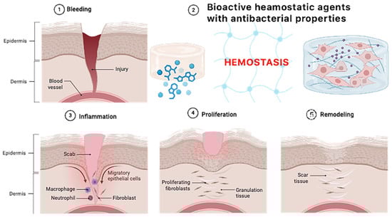 The skin serves as a critical defensive barrier, providing thermal insulation, retaining fluids, and protecting against pathogens that could otherwise enter the body from the external environment [1,2]. The process of wound healing following an injury is highly complex, involving a precisely coordinated cascade of biological events that must occur in a specific sequence and timeframe. Repair begins immediately after a wound is inflicted, with hemostasis being one of the initial stages. This step is crucial for stopping bleeding, which commonly results from traumatic events such as vehicular accidents, surgical procedures, or combat injuries. Uncontrolled hemorrhage in such cases poses a significant challenge for first responders and medical professionals, particularly in pre-hospital care settings, where rapid intervention is essential to prevent excessive blood loss. Hemorrhage remains one of the leading causes of mortality at the scene of an incident—accounting for approximately 50% of fatalities in accidents and over 90% in trauma cases involving soldiers [1,2,3,4].