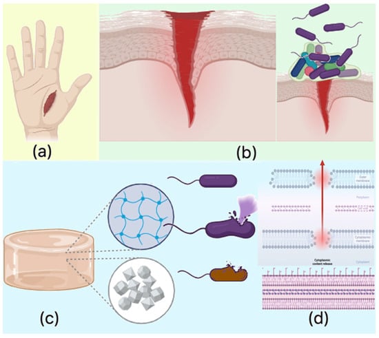 Possible mode of action of hemostatic agents: (a)—injury; (b)—bleeding, wound formation, and biofilm formation; (c)—antibacterial activity of the biomaterial; (d)—pathogen membrane disruption and bacteria death.