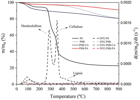 Figure 1 depicts the thermal stability of the adsorbents produced. The solid line shows the weight loss as a function of temperature (TG), while the DTG curve (dotted lines) represents the decomposition rate, which allows for the identification of the different degradation stages. In PS pyrolysis, four decomposition stages are revealed. First, the moisture loss occurs between 80 and 150 °C, with a weight loss of 5.5%. Subsequently, at 250 °C, the decomposition of hemicellulose begins, with the highest decomposition rate at 290 °C. This is followed by the degradation of cellulose (300–400 °C), reaching a maximum decomposition rate at 355 °C [16]. Finally, the decomposition of lignin is observed, with a small shoulder around 400 °C. However, lignin degradation occurs over a wide temperature range (250–550 °C), indicating that lignin degradation also takes place during the decomposition of cellulose and hemicellulose [17]. The adsorbents produced from PS exhibit high thermal stability. All samples present an initial stage of moisture and physisorbed compound loss at 80–120 °C, with the most significant mass loss observed for PSB-CA (≈8%). This result aligns with the findings of Fu et al., who attributed this phenomenon to the hygroscopic property of alkali potassium [18]. A second step follows, characterized by the volatilization of the char. The PSB sample shows a marked loss beginning at 450 °C, as this was the final pyrolysis temperature, and thus, the sample has not been exposed to higher temperatures.