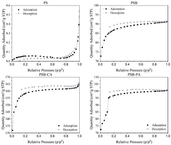 Additionally, N2 adsorption–desorption isotherms of the adsorbents are presented in Figure 2. According to the IUPAC classification, the N2 adsorption–desorption isotherm of the PS could be classified as Type III, where there is a lack of adsorption due to the weak adsorbate–adsorbent interaction. In contrast, the isotherms for PSB, PSB-CA, and PSB-PA can be classified as Type I-b with an H4 hysteresis loop [21]. It has been observed that none of the adsorption isotherms close with the desorption isotherms at low pressures. This phenomenon, known as low-pressure hysteresis, is attributed to the strong presence of micropores [22].
