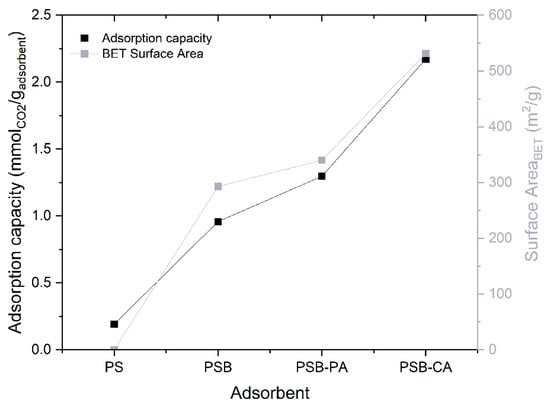 PSB-CA exhibits the highest CO2 capture rate (2.17 mmolCO2/gadsorbent), indicating that KOH activation significantly enhances the adsorption capacity of the biochar. It is followed by PSB-PA, PSB, and PS with 1.30, 0.96, and 0.19 mmolCO2/gadsorbent, respectively. PS exhibits almost no adsorption capacity and therefore slower adsorption kinetic. Figure 4 illustrates the relationship between the specific surface area and the capture capacity of the adsorbents, clearly demonstrating that a higher surface area correlates with greater adsorption capacity. Surface area and microporosity play a significant role in physisorption, which is the primary mechanism contributing to the CO2 capture capacity of the biochar-based adsorbents [24]. In addition, the alkalinity of the adsorbent plays a major role in CO2 uptake. The presence of basic elements, such as K in the case of PSB-CA, enhances CO2 capture through chemical sorption by forming salts like K2CO3, as demonstrated by Xu et al. [25]. The adsorption results of PSB-CA are highly competitive compared to other adsorbents (0.7 to 5.4 mmolCO2/gadsorbent), such as metal–organic frameworks (MOFs), zeolites, activated carbons, or porous silica [26,27]. This competitiveness is not only due to its adsorption capacity falling within the expected range, but also because its synthesis follows a waste-to-resource strategy, contributing to environmental sustainability [28].
