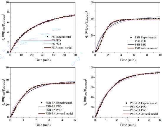 On the other hand, non-linear fitting provides greater accuracy, demonstrating that this technique is much more reliable and offers a deeper knowledge of the adsorption phenomena, as seen in Table 5 and Figure 8. R2 values greater than 0.9 are obtained for all the models, with qe values closer to experimental values. Among the models, it is concluded that the Avrami model most accurately represents the experimental CO2 capture values. The parameters obtained from the Avrami equation provide valuable insights into the interaction of CO2 and the adsorbent’s surface and pore structure [40]. For PS, the nAv value is significantly less than 1, indicating a slow adsorption process, mainly due to the limited number of available adsorption sites on the material. After pyrolysis, the number of adsorption sites increases, as reflected in a higher nAv value for the PSB. In physical and chemical activation, the nAv values decrease to slightly above 1, suggesting a more complex CO2 capture mechanism in these adsorbents. This suggests the formation of multiple layers of adsorbed CO2, leading to progressive adsorption within the pores, primarily due to the microporous structure of the adsorbents, especially for PSB-CA [41,42].