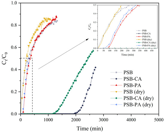 Dynamic H2S capture experiments were conducted for the adsorbents derived from PS, with the exception of PS, which showed minimal CO2 adsorption capacity and was assumed to have zero H2S adsorption. In this work, we studied the moisture content effect of the biochar. For this purpose, tests were performed using the adsorbent with its original moisture content and after a drying pretreatment. The adsorbent’s breakthrough capacity was defined as the time when the H2S concentration reached 10 ppmv. Figure 9 presents the breakthrough curves for H2S capture. Similarly to CO2 capture results, chemically activated biochar (PSB-CA) demonstrated the best performance, with an adsorption capacity of 9.6 mgH2S/gadsorbent and a breakthrough time of 2260 min. PSB-CA effectively removes H2S, leaving no detectable levels (<1 ppm) in the outlet gas before breakthrough occurred. In contrast, PSB and PSB-PA have significant lower H2S adsorption capacities, with values of 0.14 mgH2S/gadsorbent and 0.58 mgH2S/gadsorbent, respectively. Some authors attribute H2S capture capacity fundamentally to the adsorbent’s higher surface area. However, this hypothesis may not fully explain the observed differences between the sorbents, as the variation in adsorption capacity is significantly higher than the difference in surface area. Furthermore, the adsorption capacity would be improved if the sorbent was subjected to a previous drying process, where moisture and physisorbed molecules would be removed, allowing H2S adsorption in the active sites. The results show that the surface area trend in adsorption capacity is consistent. However, in this case, their adsorption capacity decreases when the adsorbent undergoes dry pretreatment. PSB-CA shows a 33% capacity reduction, achieving an adsorption capacity of 6.4 mgH2S/gadsorbent, whereas PSB-PA present a capacity decrease to 0.52 mgH2S/gadsorbent, representing a 10% loss in H2S adsorption capacity.