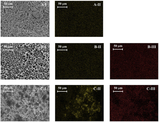 SEM and EDS mapping of fresh PSB-CA (A-1), PSB-CA after H2S adsorption (B-1), and PSB-CA after adsorption under dry conditions (C-1). The potassium distribution is color yellow (A-II, B-II, and C-II), while the sulfur content is in red (B-II,C-III).