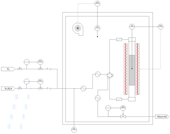 Dynamic H2S capture studies were performed in a Microactivity Pro unit, as illustrated in Figure 12. The adsorbents are introduced into a Hastelloy C tubular reactor to prevent corrosion and issues arising from the presence of sulfur compounds. The reactor, with a diameter of 1.02 cm and a height of 380 cm, is placed in a cylindrical furnace to control the temperature. The entire system is enclosed in an electrically heated box, which can preheat the inlet gases. Gases are injected and mixed using mass flow controllers (MFCs). TIC (temperature indicator controller) and PIC (pressure indicator controller) devices regulate the system’s temperature and pressure. The maximum gas flow rate is 4.5 NL/min, and the system allows for reactions to be studied at temperatures up to 600 °C and pressures up to 30 bar. Further details are provided in previous works published by the authors and research group members [53,54].