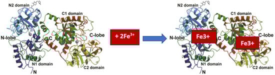 Iron binding is reversible, so proteins can exist in iron-free (apo-LF) and iron-bound (holo-LF) forms (Figure 1) but also partially iron-bound (mono-LF) forms [99]. At the same time, it is possible for iron to be bound by one or both lobes of the LF molecule. Under physiological conditions in LF, only part of the iron-binding sites in the molecules are filled (usually 10–20%) [100].