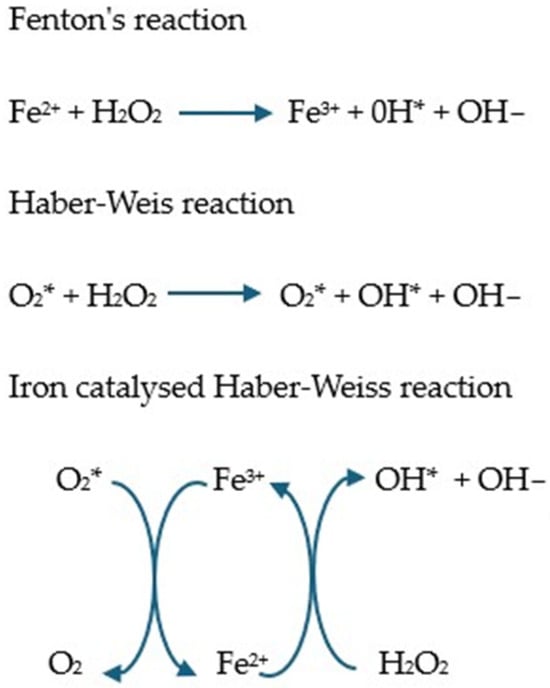 Iron, due to its ability to exist on two oxidation levels (Fe2+ and Fe3+), has a high capacity to generate ROS [131]. Under physiological conditions, its metabolism is controlled to prevent the excessive accumulation of the free form. However, in pathology, highly reactive unbound iron can be formed, generating oxidative stress in the Fenton and Haber–Weiss reactions (Figure 2) [132]. In particular, the hydroxyl radical is a potent oxidant causing lipid peroxidation and apoptosis [128].