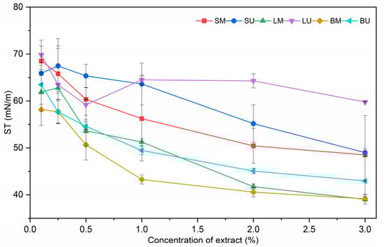 Surface tension (ST) at air/water interface of artichoke by-product extracts as a function percentage of the extracts in the aqueous phase. Acronyms: leaves macerated (LM), leaves sonicated (LU), stems macerated (SM), stems sonicated (SU), bracts macerated (BM), and bracts sonicated (BU).