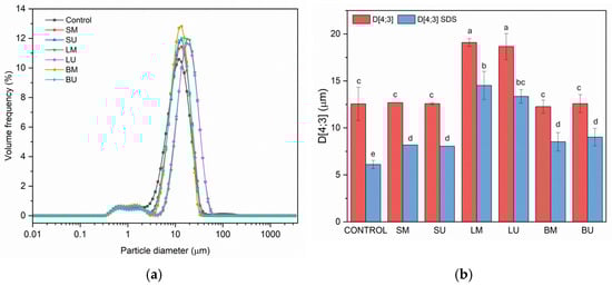 (a) Distribution size distribution of the o/w emulsions enriched with 100 mg kg−1 of extract and of the control sample; (b) droplet size of the oil droplets measured in water and in SDS solution. Acronyms: leaves macerated (LM), leaves sonicated (LU), stems macerated (SM), stems sonicated (SU), bracts macerated (BM), and bracts sonicated (BU). Different letters indicate significant differences among samples (p < 0.05).